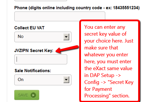 NOTE: You can put in ANYTHING you want in the DAP secret key (in dap setup -> config). Say that you set it to DAPKEY. Now when you go to JVZoo My Account => JVZIPN Secret Key, make sure to set the jvzoo secret key to DAPKEY there too. It has to EXACTLY match whatever you set the dap secret key to.