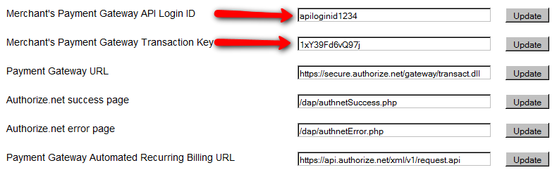 - Enter the “API Login ID” and “Transaction Key” that you noted down earlier (Step #9 above) into the respective fields, and click “Update” next to the fields to save the changes.