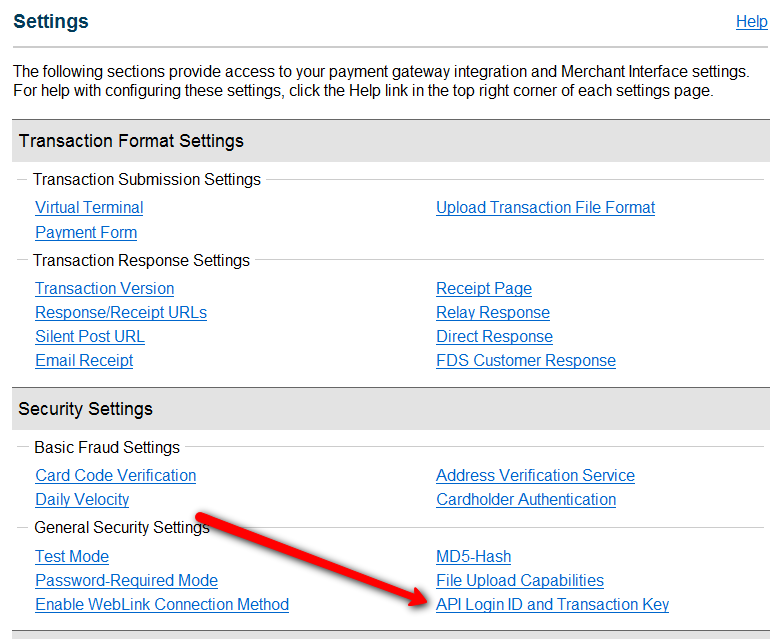 - On the Settings page, now click on the “API Login ID and Transaction Key” link towards the bottom.