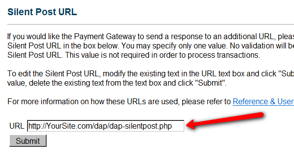 - On the next page, set the URL field, to http://YourSite.com/dap/dap-silentpost.php . Be sure to change the text “YourSite.com” to your actual domain name. Click “Submit”. It will take you back to the Settings page.