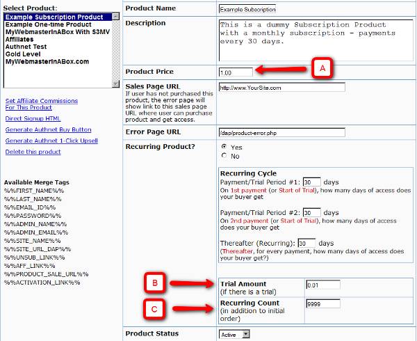 - NOTE: The DAP Authorize.net allows 1 trial. So in the recurring cycle fields, make sure “Payment/Trial Period #2” and “Payment/Trial Period #3” are both the same (set to same number of days: like 30). Example below shows the setting for a “7 day” trial period, followed by recurring payments every “30 days”.