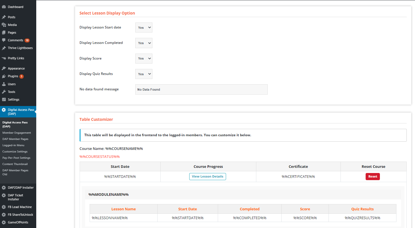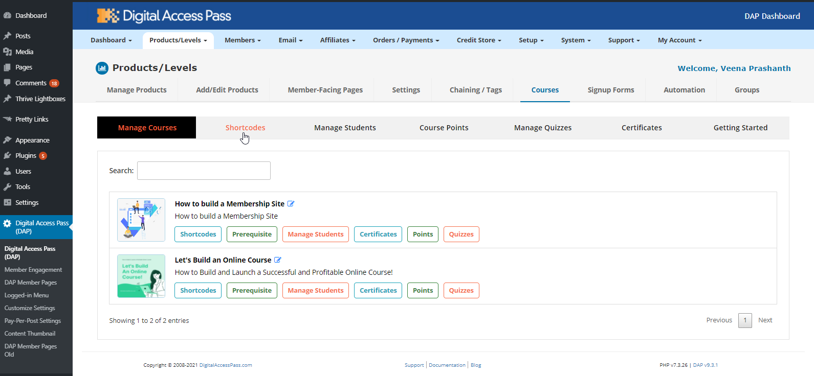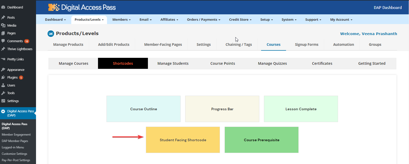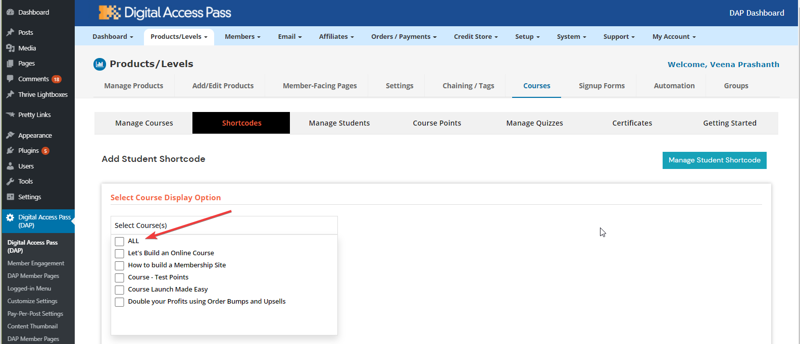On the student-facing shortcodes page, you can select ALL courses or select individual courses. DAP will only display the selected courses to the logged-in members.