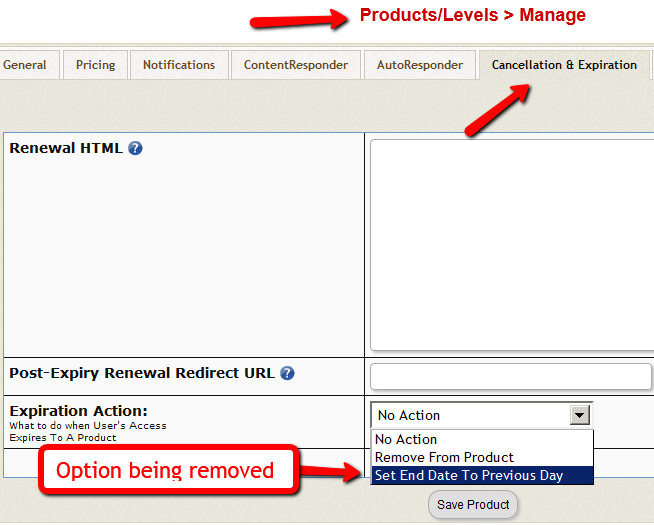 On the Products > Manage screen, on the new Cancellation & Expiration tab, DO NOT set the Expiration Action field to Set End Date To Previous Day as it can cause access start/end dates of subscribers (in certain cases) to be set to invalid dates.