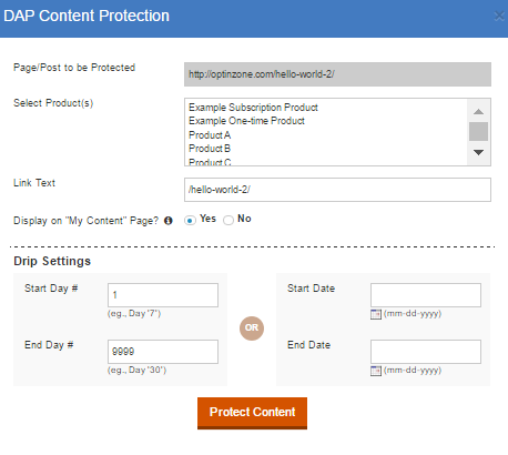 - Even if a page/post is already protected in DAP (via DAP contentresponder), you can still edit the drip setting directly in WP dashboard.